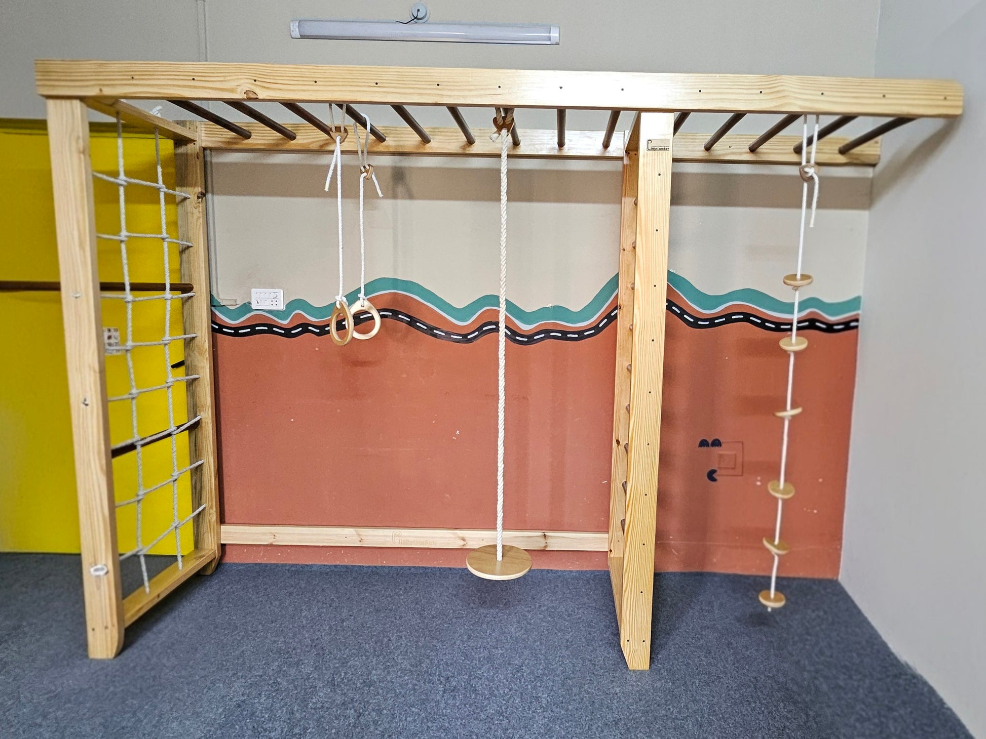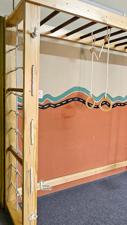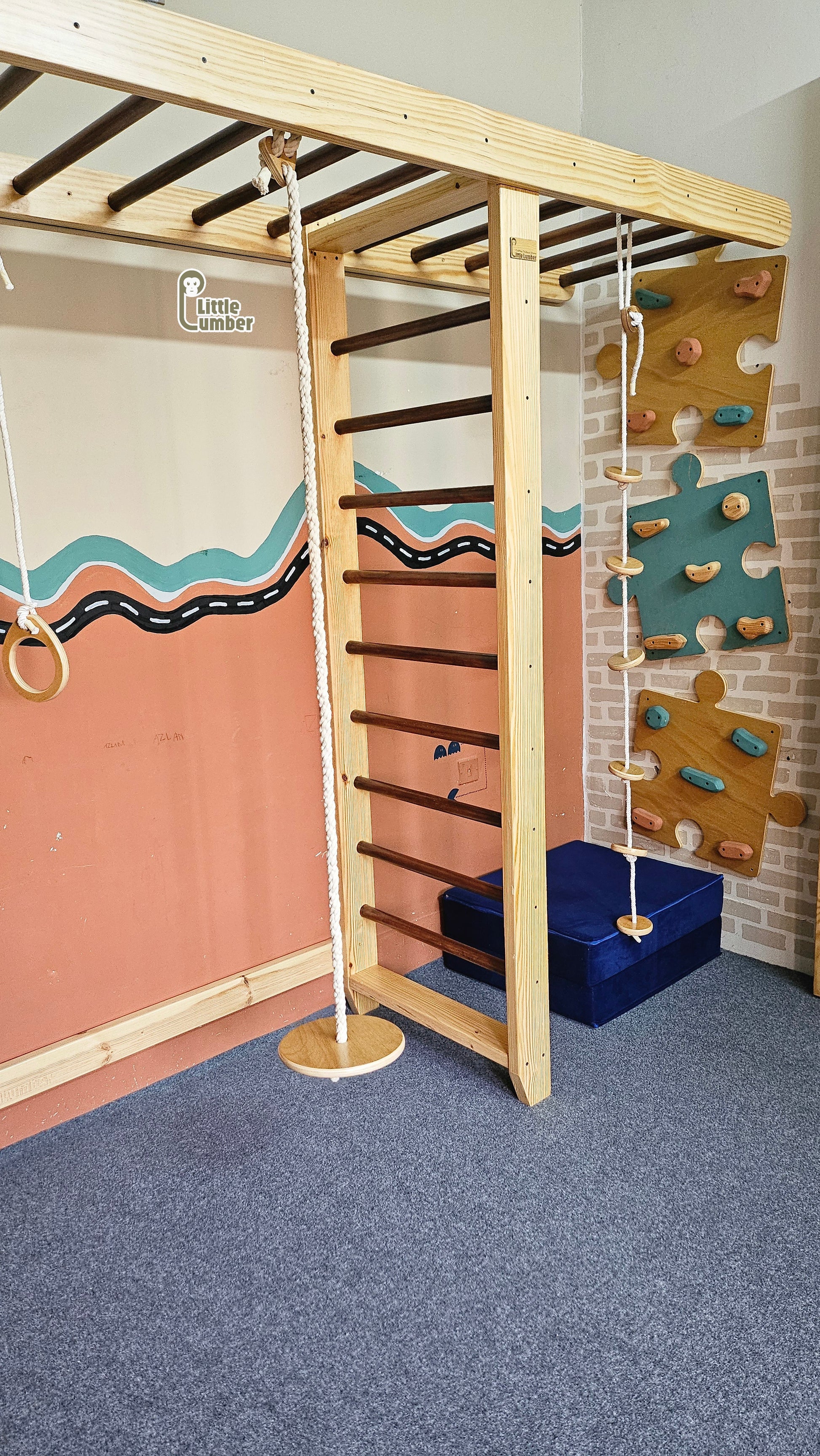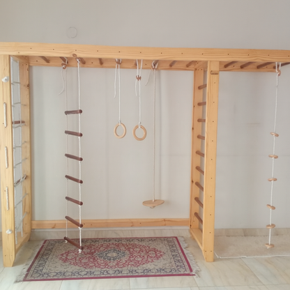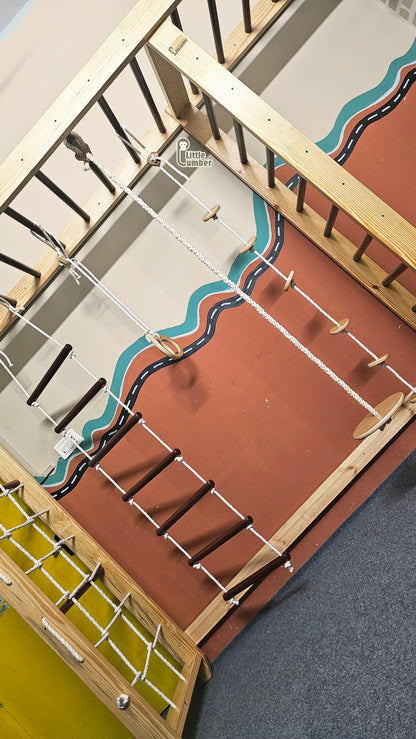 The Tri-Climb Bridge is a durable wooden play structure designed to bring active, imaginative and screen-free fun into your home. Featuring a climbing ladder, monkey bars, a climbing net, and essential gym accessories, it offers multiple ways for kids to move, explore, and build strength. Its sturdy design supports balance, coordination, and confidence while transforming any indoor space into an exciting adventure zone..